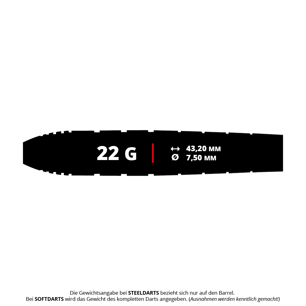 Jeder Wurf fühlt sich exakt so an, wie es Luke fokussiert auf dem Weg zum Weltmeistertitel erlebt hat. Das Barrel–Design unterstützt flüssige Würfe und maximale Kontrolle, der feine Radialgrip gibt dir sicheren Halt – egal, wie nervös es auf die Doppel–16 geht.